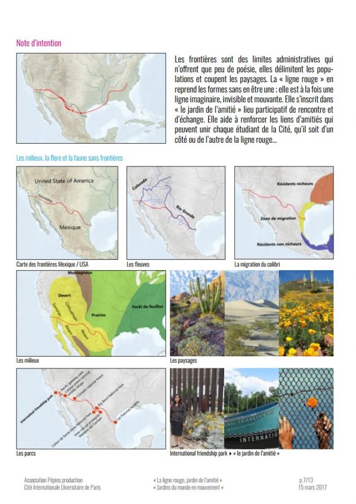 Le jardin privilégie les liens d’amitié entre ces deux pays frontaliers, mais aussi deux maisons voisines à la Cité internationale, tout en rappelant que la culture n’a pas de frontière. La ligne rouge, symbolisée par un mur de tiges métalliques érigées de plusieurs mètres de haut entre la maison du Mexique et des Etats-Unis, évoque une frontière physique entre ces deux pays. Or, ces bornes administratives n’offrent que peu de poésie : elles délimitent les populations et coupent les paysages.