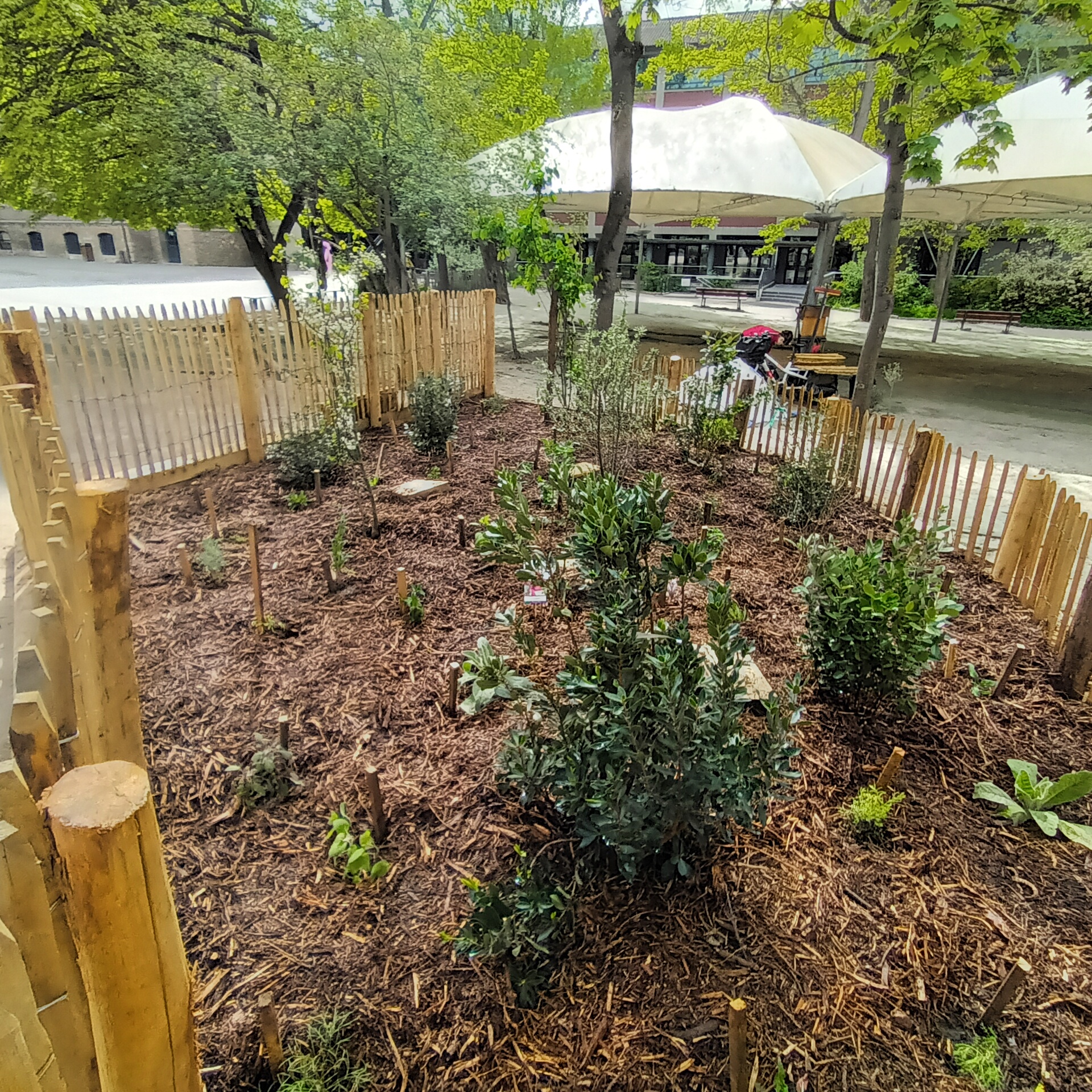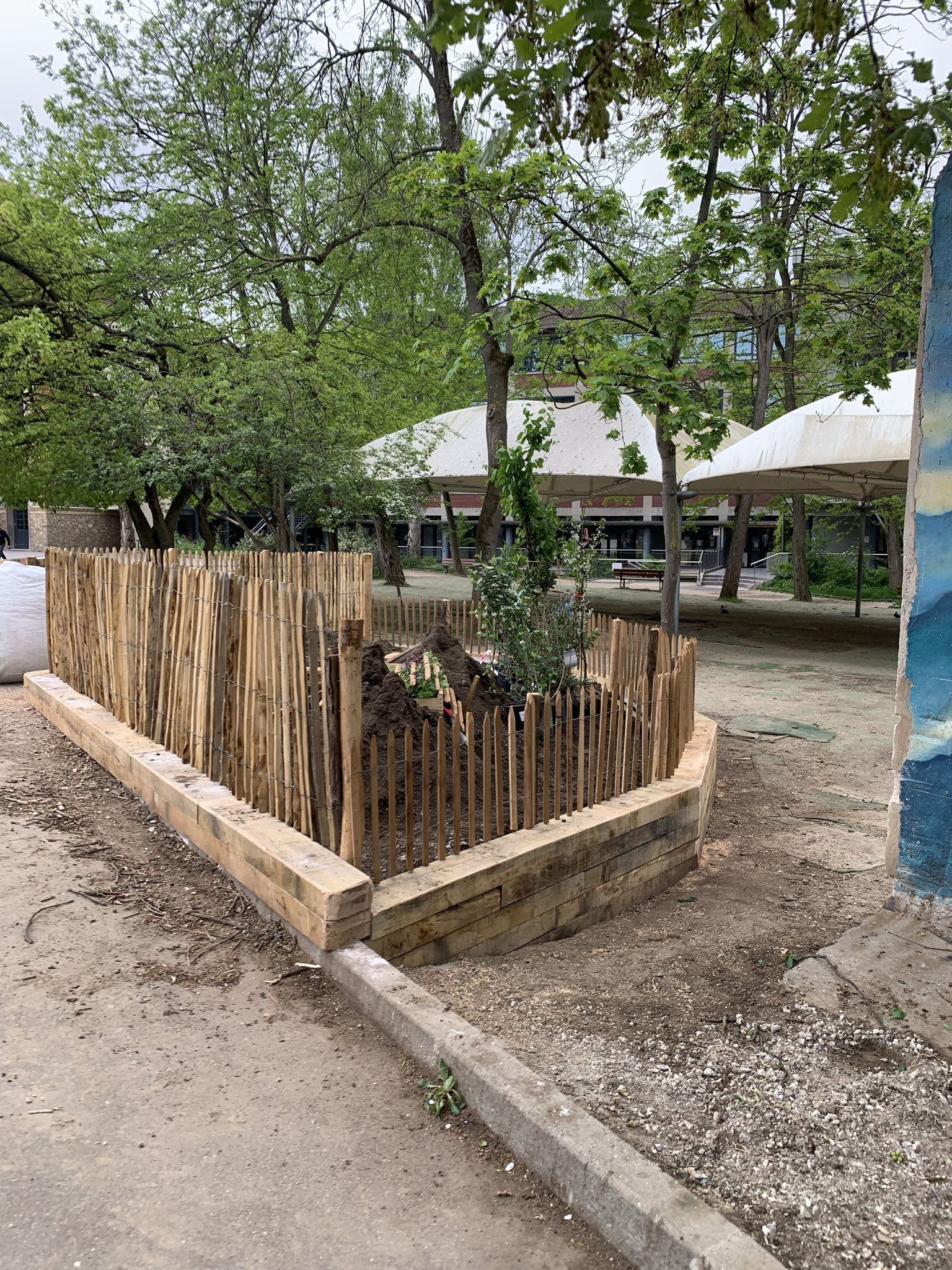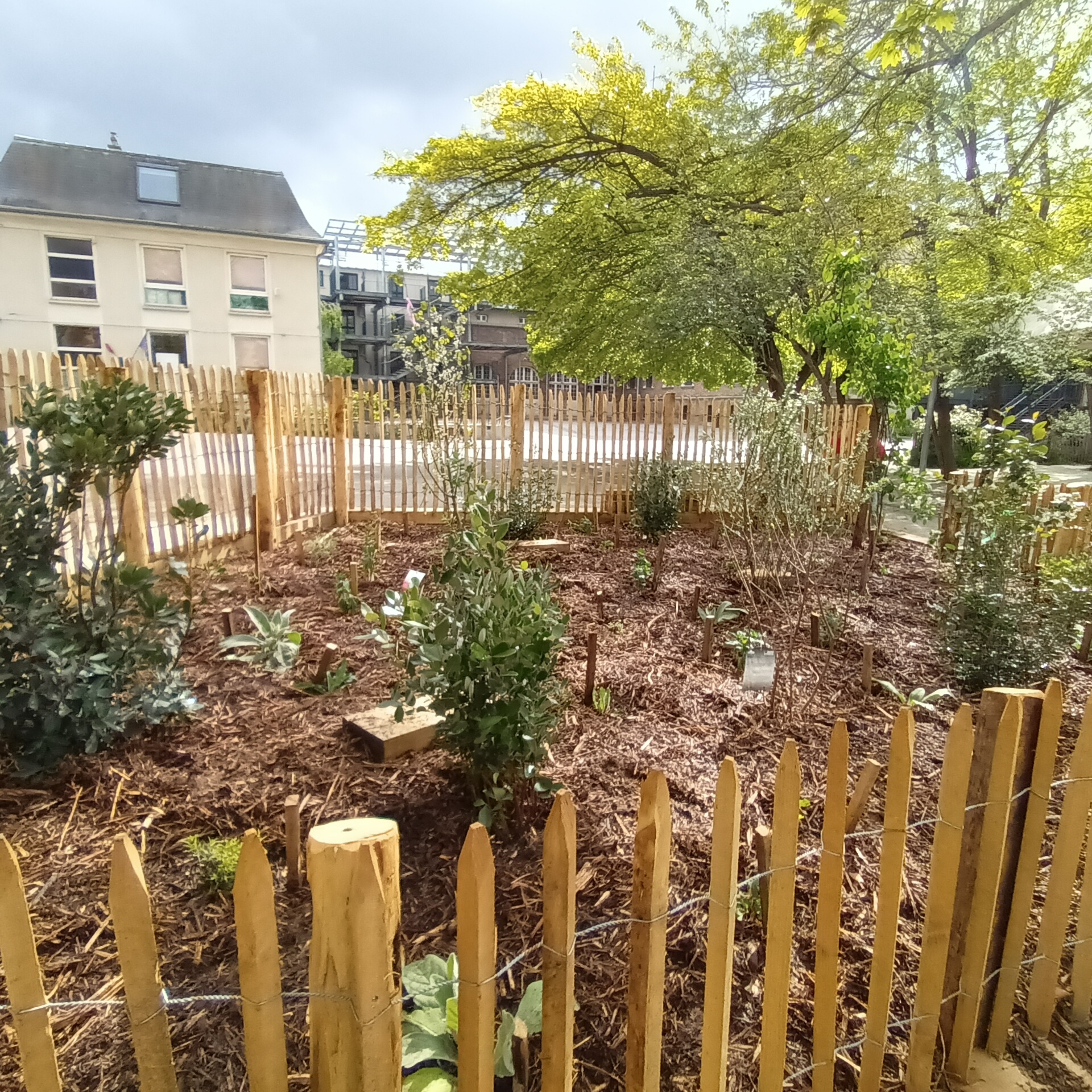 Dans la continuité des aménagements pour l’école Jeanne d’arc nous avons réalisé un massif paysager sur élevé où il n’y avait rien avant.